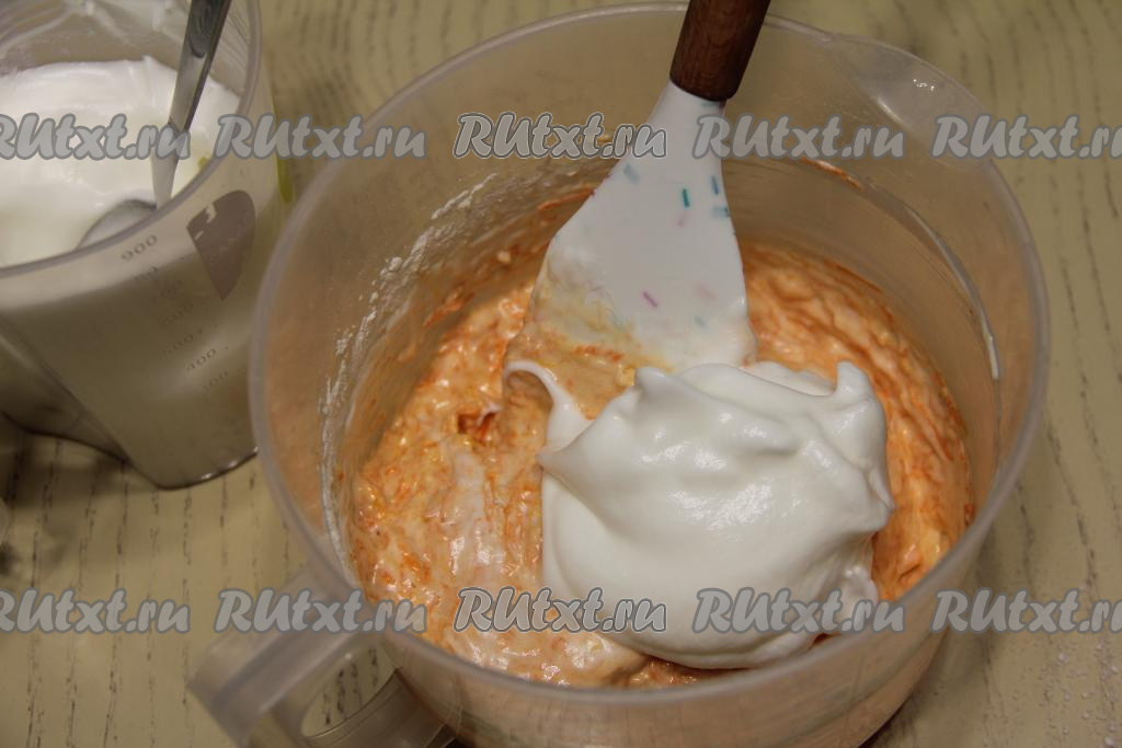 Тесто перемешать лопаткой. Затем в несколько приёмов в морковное тесто ввести взбитые белки, аккуратно вмешивая их движениями лопатки снизу-вверх.