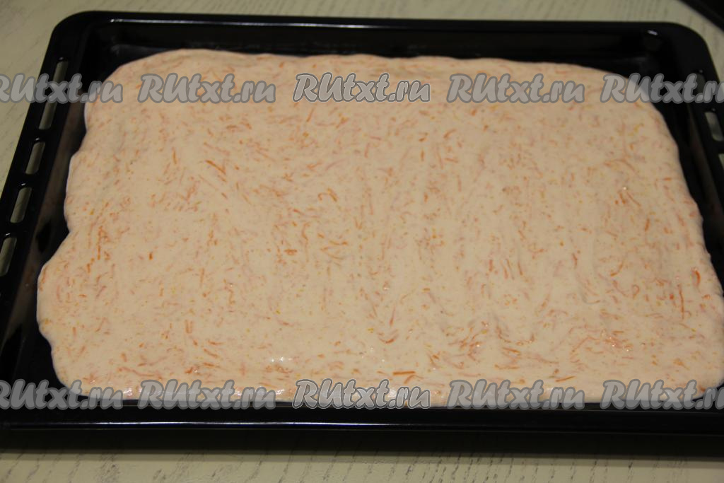 Противень (у меня размером 30х30 сантиметров) застелить ковриком (или пергаментом) для выпечки, выложить морковно-бисквитное тесто и разровнять.