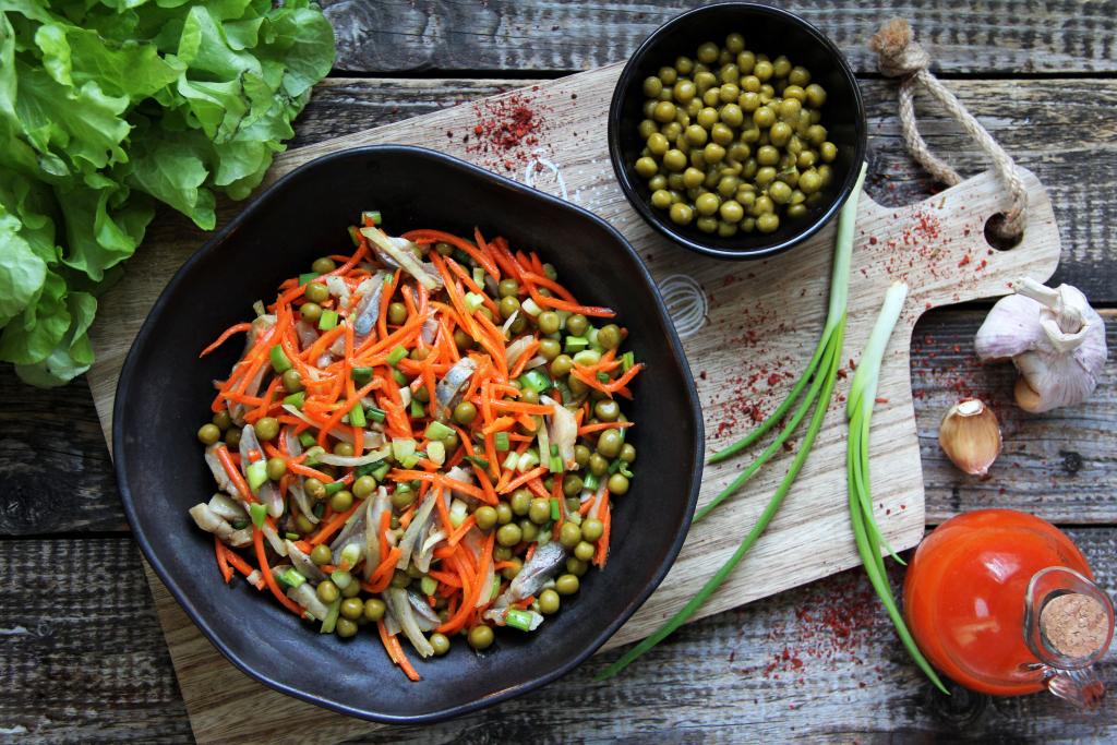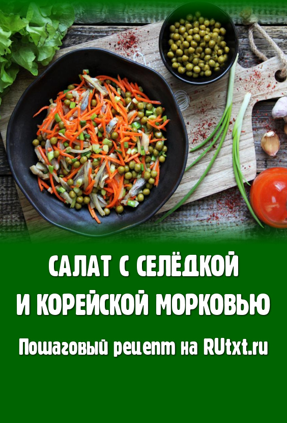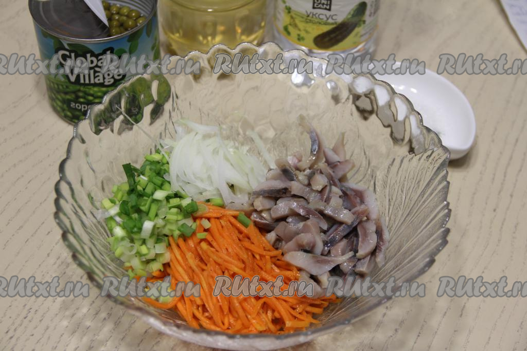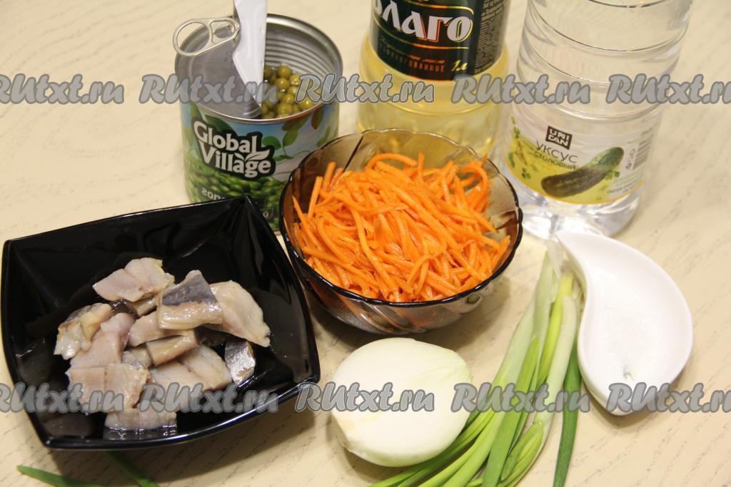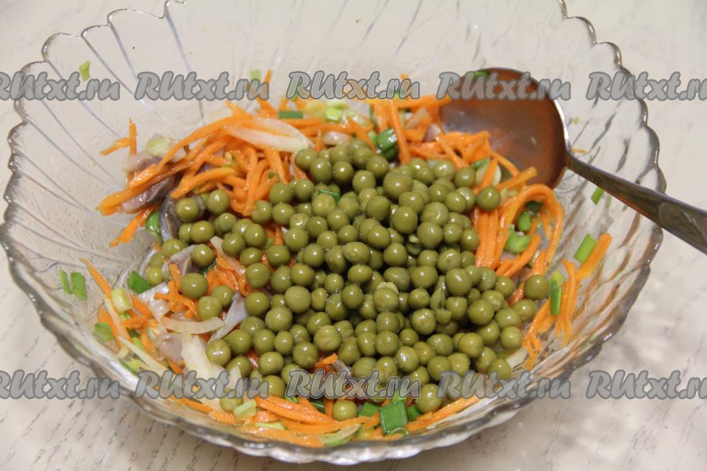 Вкусный, яркий, аппетитный салат, приготовленный с селёдкой, горошком и корейской морковью, можно сразу подавать к столу.