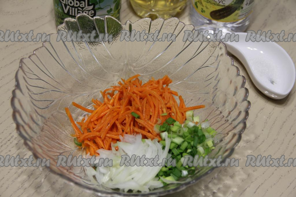 Если полоски корейской моркови длинные, тогда разрежьте морковку на несколько частей. В салатник выложить корейскую морковь, добавить тонко нарезанный репчатый лук и мелко нарезанный зелёный лук.