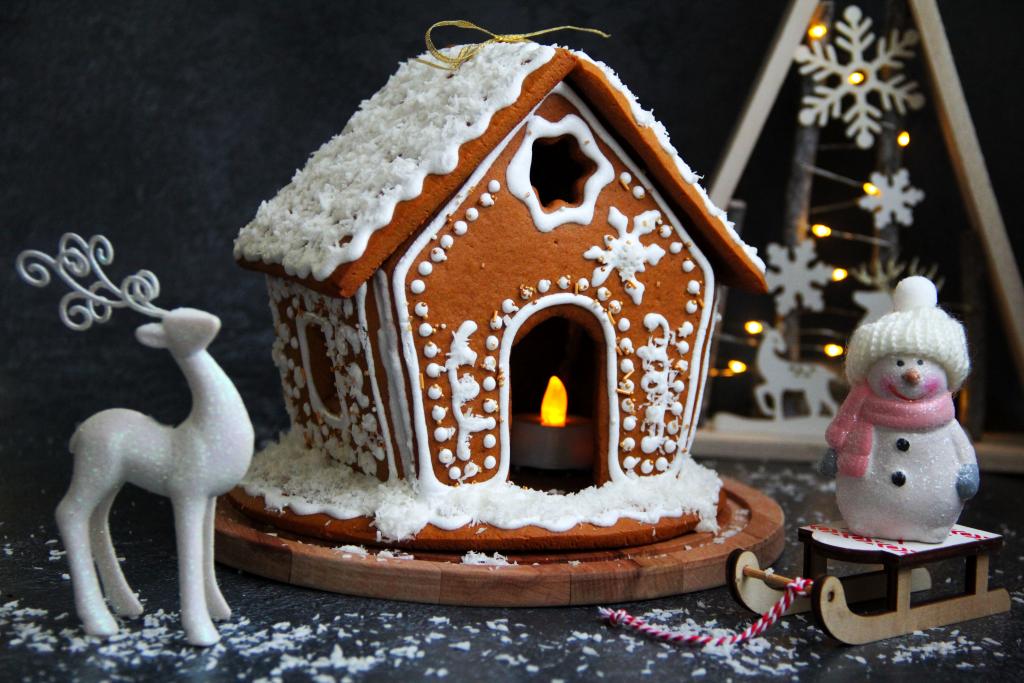 Дальше склеить детали домика глазурью. Для этого нужно будет ещё раз сделать глазурь с помощью миксера из такого же количества ингредиентов, которое использовали для росписи деталей. Для скрепления деталей дома нужны помощники, чтобы придерживать стенки. Можно слегка скрепить стенки ленточкой и оставить домик до полного застывания глазури. Я на крыше сделала два отверстия, а затем продела ленточку в отверстия и связала две половинки крыши. А затем просто поместила крышу на высохший домик.