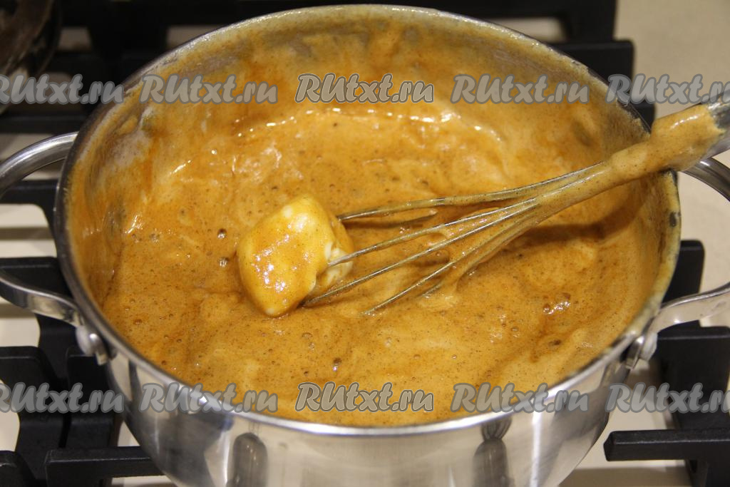 Перемешивая массу венчиком, томить на небольшом огне минут 5. Масса начнёт значительно увеличиваться в объёме, а затем станет приобретать карамельный цвет.