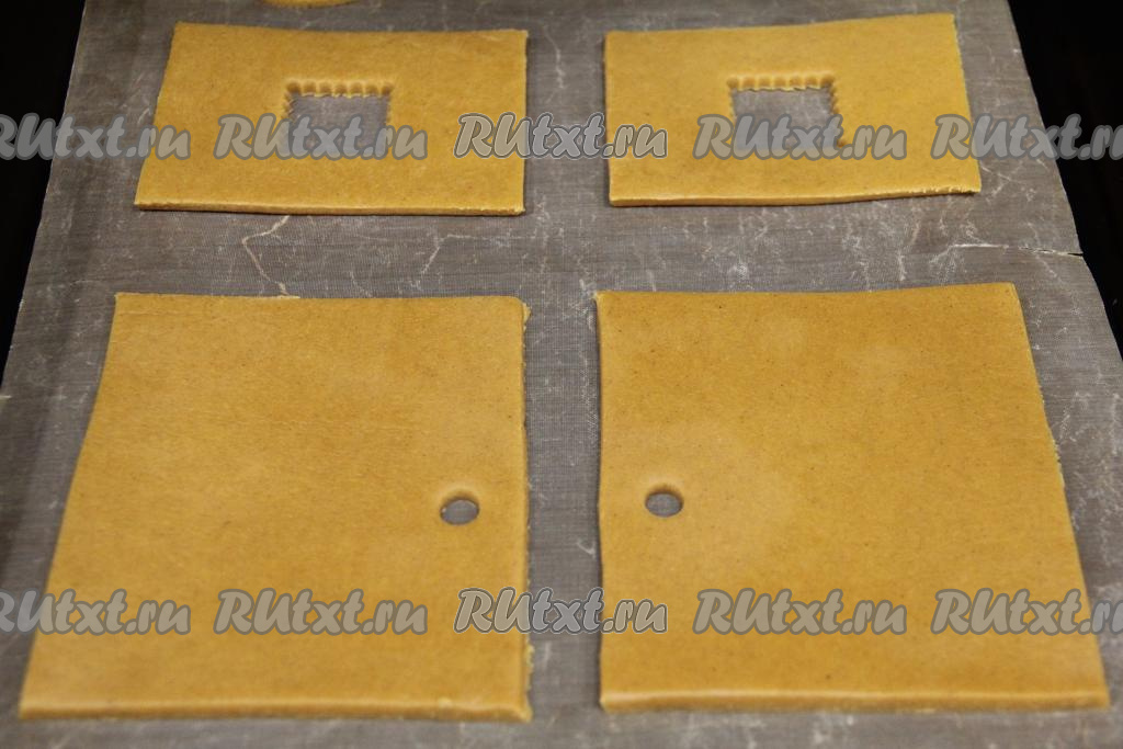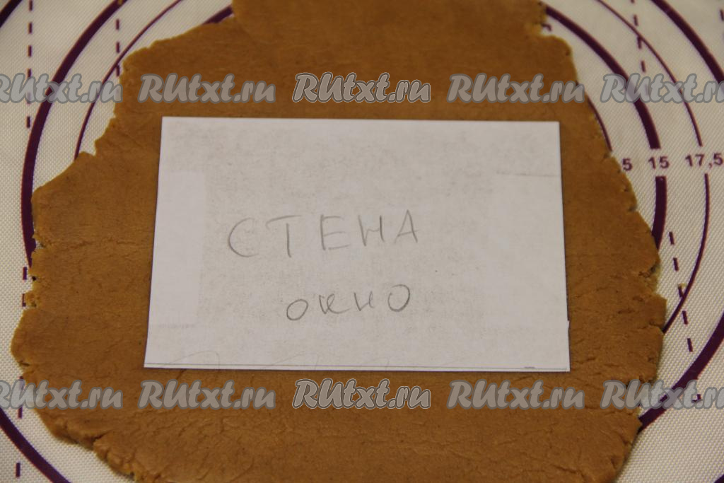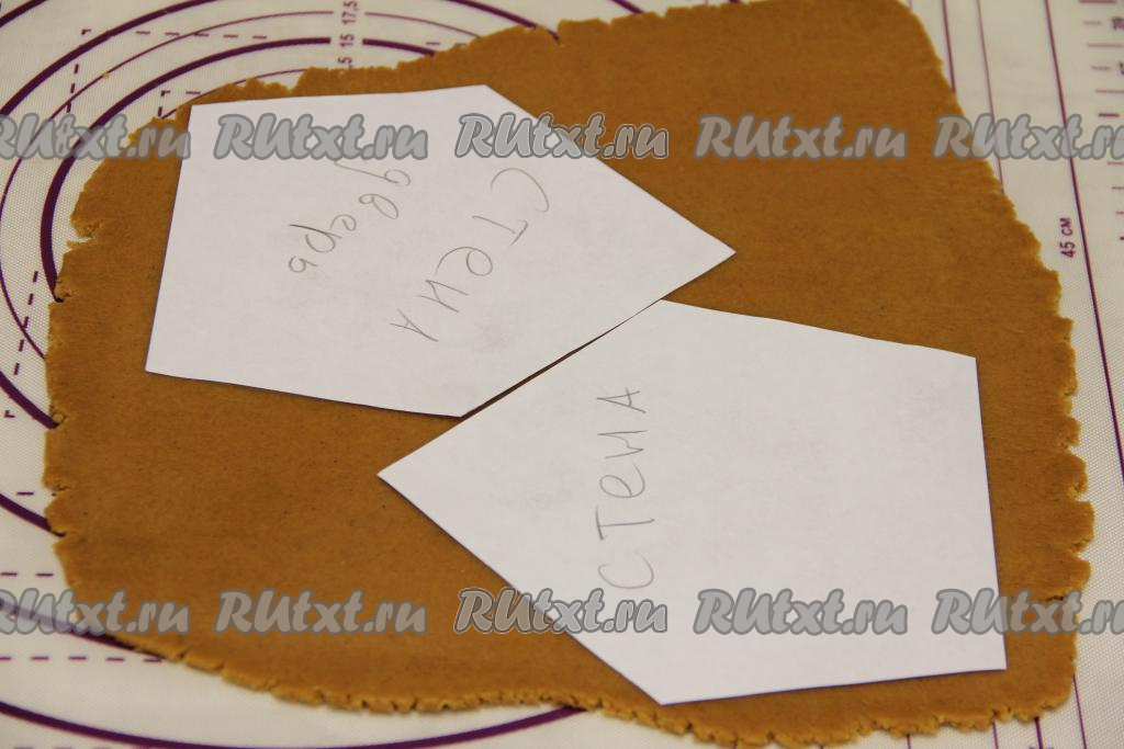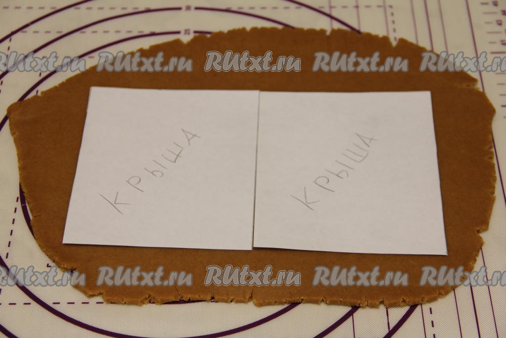 Вырезать из теста детали домика по трафарету, не забывая сформировать и основу, на которой будет стоять домик. Я вырезала детали домика в двойном экземпляре, так как из этого количества теста у меня получилось 2 домика высотой 16 сантиметров. Детали домика, вырезанные из пряничного теста, переложить на противень, застеленный пергаментом (или ковриком для выпечки).