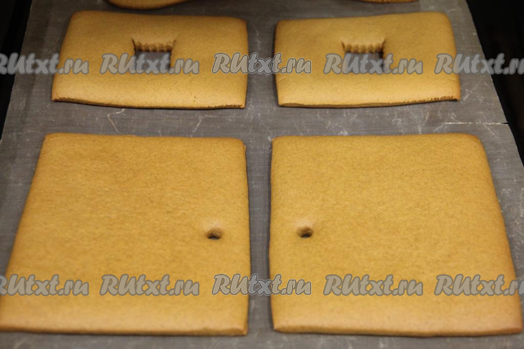 Выпекать части домика в разогретой духовке при температуре 180 градусов минут 10-15 (до лёгкого золотистого цвета). Из пряничного теста, оставшегося после формирования деталей домика, я вырезала пряники, а затем испекла их. Дать деталям домов полностью остыть.