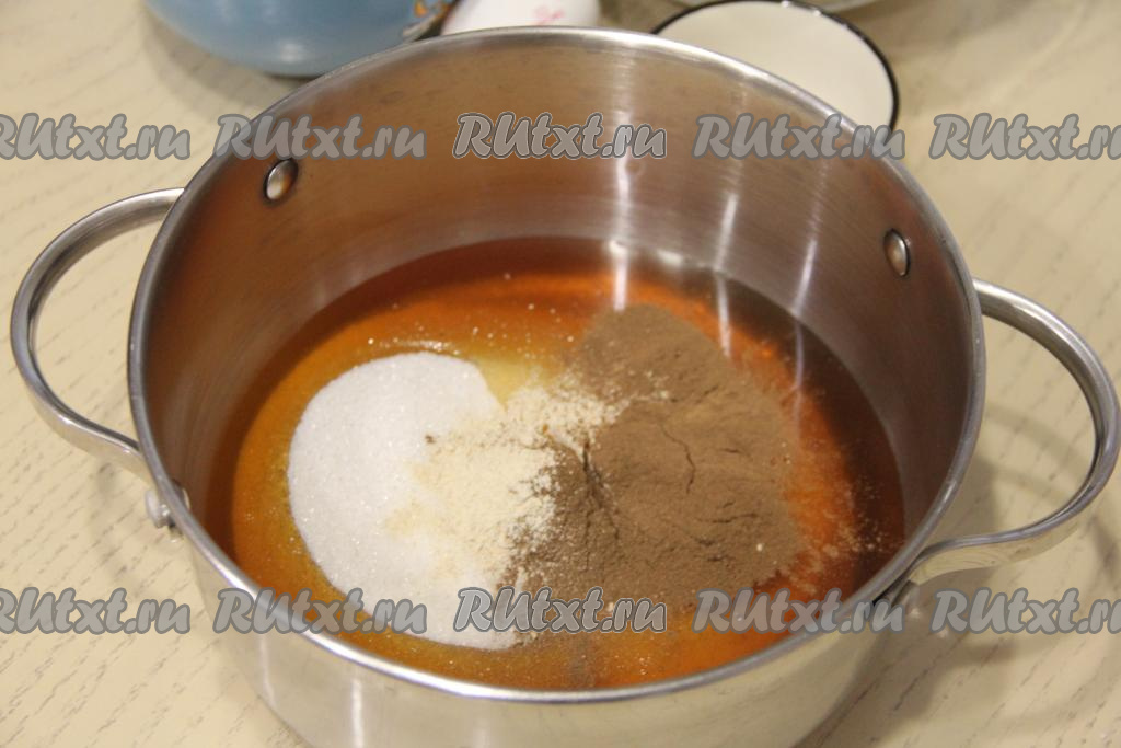 В глубокую кастрюлю влить мёд, добавить сахар, имбирь и корицу.