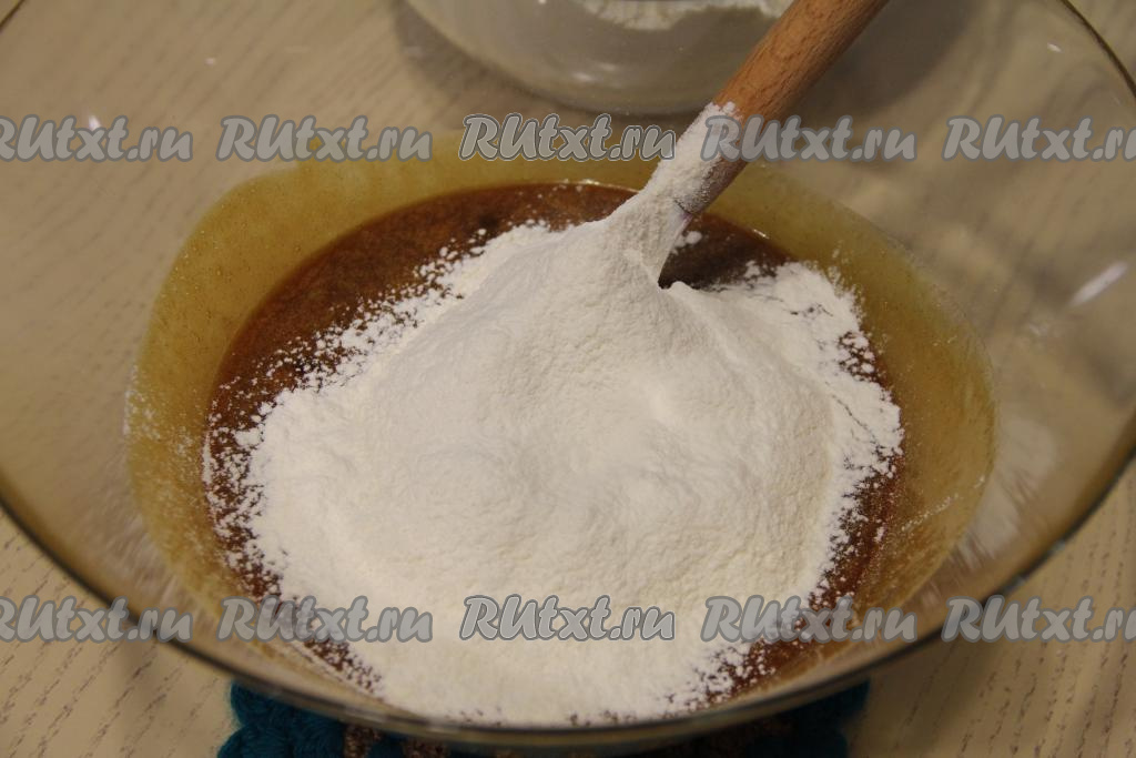 Всыпать просеянную муку небольшими порциями, тщательно перемешивая тесто вначале лопаткой.
