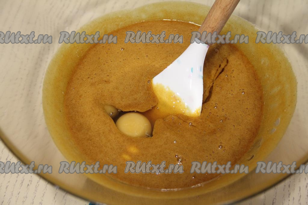 Перелить массу в миску для замешивания теста, дать немного остыть. Затем по одному добавить яйца, хорошо вмешивая их в тесто.