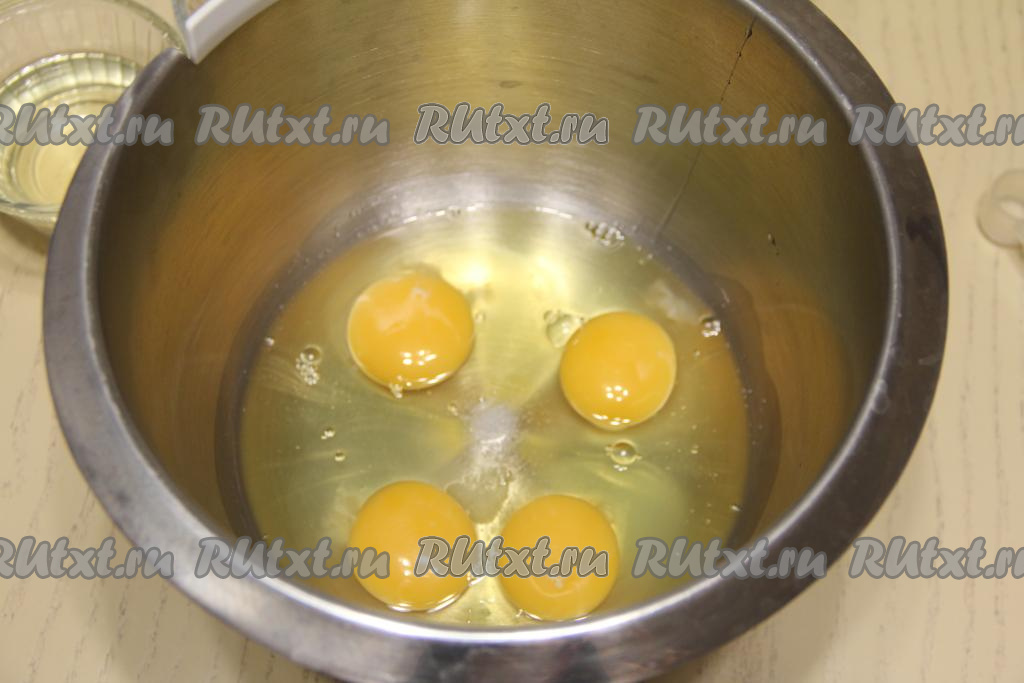Вбить яйца в чашу миксера, добавить соль и взбить миксером до увеличения в объёме и побеления массы.