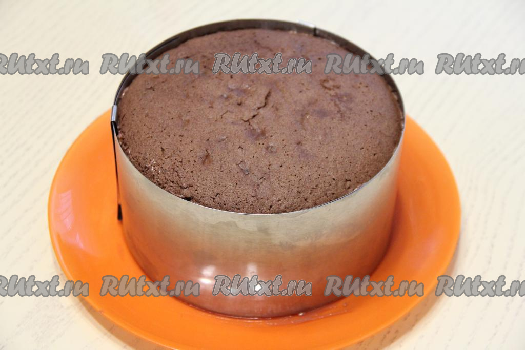 Готовый бисквит достать из духовки. После того как он немного остынет, вынуть его из формы и полностью остудить на решётке. Разрезать остывший бисквит на 4 части. Подготовить все продукты для приготовления крема для торта. Сливочное масло должно быть комнатной температуры, поэтому заранее достаньте его из холодильника.