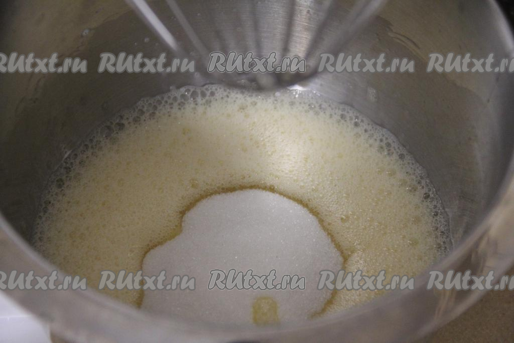Всыпать сахар и взбивать ещё минут 7 (до пышного состояния).