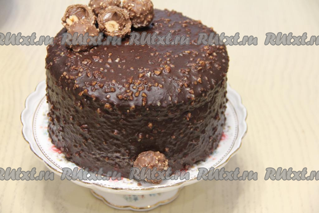 Собрать торт "Ферреро Роше", для этого смазать три коржа кремом и сложить их один на другой, сверху выложить четвёртый корж (смазывать его кремом не нужно). По желанию, зажать торт в разъёмную форму и поставить в холодильник на ночь.