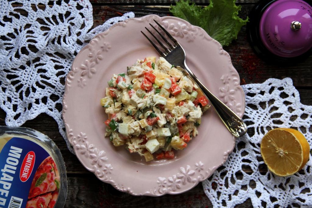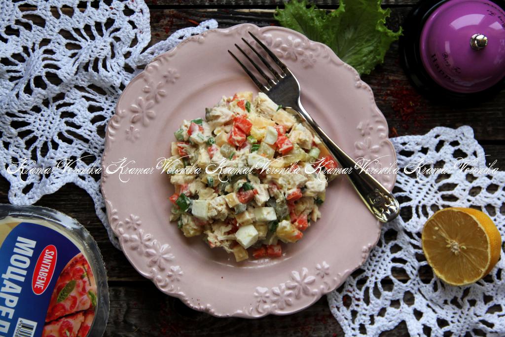 Очень нежный и вкусный салат "Оливье" с сыром подать к столу.
