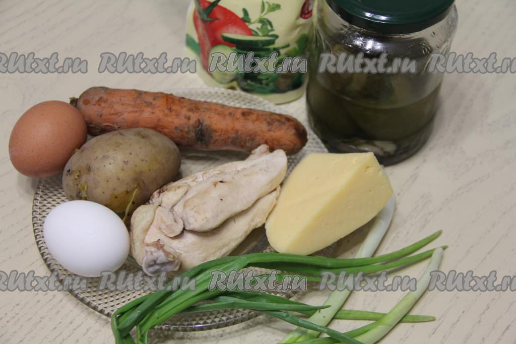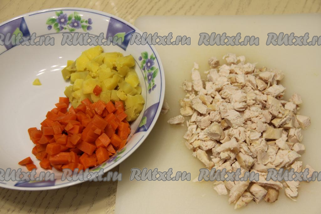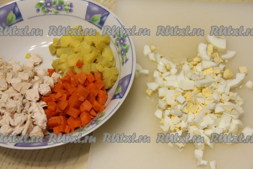 Подготовить продукты. Картошку и морковку сварить в кожуре до полной готовности (на варку потребуется минут 25 с момента закипания воды, полностью готовые варёные овощи будут легко прокалываться ножом), затем достать овощи и полностью остудить. Яйца сварить вкрутую (в течение 10 минут после закипания воды), после этого остудить их и очистить. Куриное филе (или мясо с других частей курицы, например, филе бедра) отварить в подсоленной воде в течение 25-30 минут, остудить.