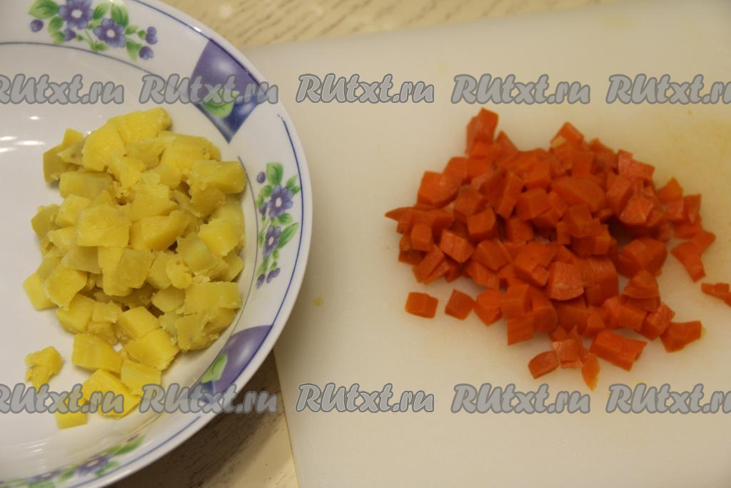 Для того чтобы салат получился более вкусным и красивым, нарезать ингредиенты нужно на небольшие кубики (примерно размером с горошину). Картошку и морковку почистить и нарезать на небольшие кубики, выложить в глубокую миску.