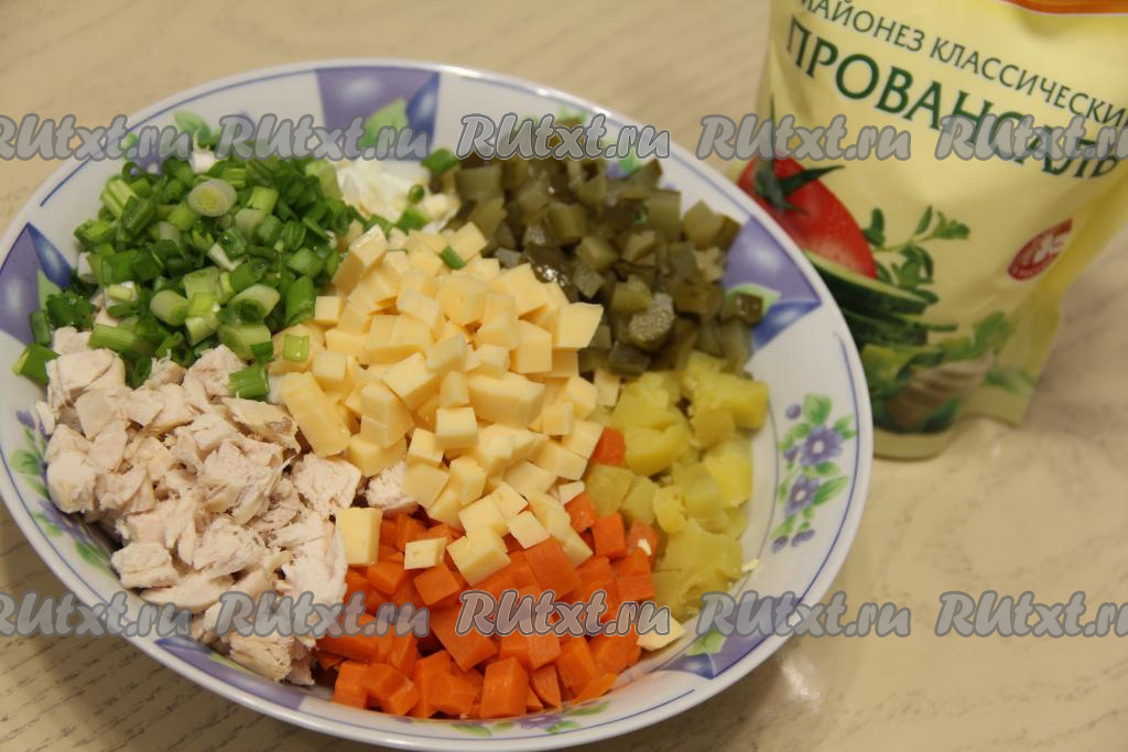 Если вам захотелось разнообразить вкус салата "Оливье", тогда предлагаю приготовить это любимое многими блюдо с добавлением сыра. Вместо колбасы возьмём варёное мясо курицы. "Оливье" с сыром готовится также просто, как и классический. Получается очень нежным. Сыр придаёт блюду сливочный вкус. В зависимости от сорта сыра, салат будет приобретать новую вкусовую нотку. Приготовьте такой "Оливье" и он, наверняка, понравится и вам, и вашим близким!