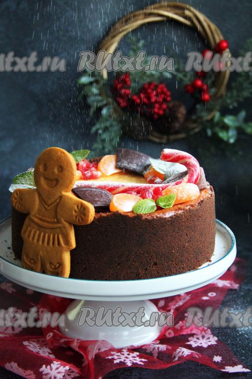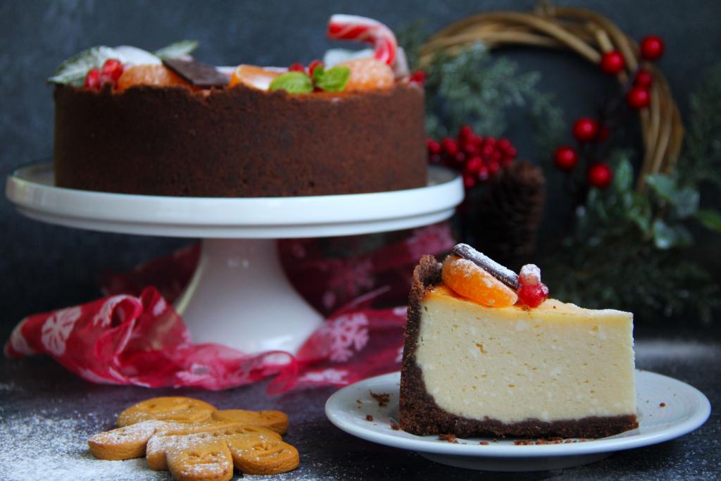 Затем убрать бортики формы и переложить чизкейк на тарелку. Верх выпечки можно украсить по своему усмотрению. Я украсила дольками мандарина и зёрнышками граната.