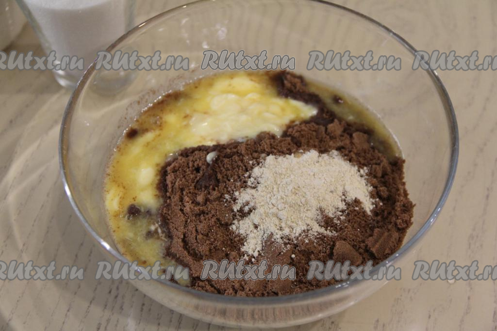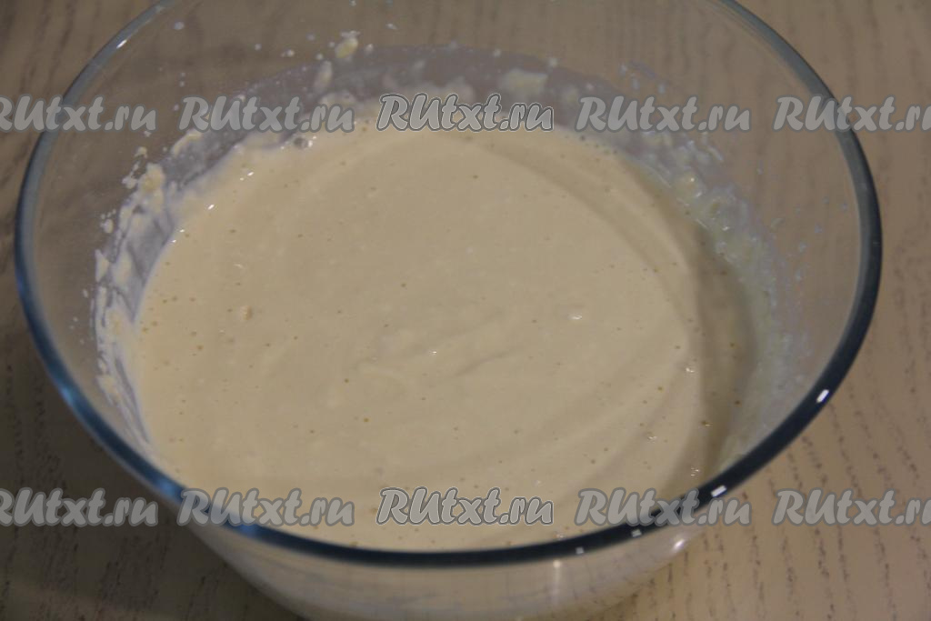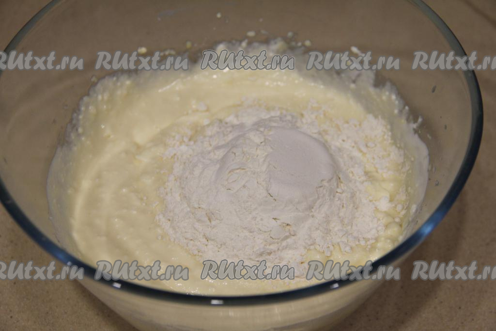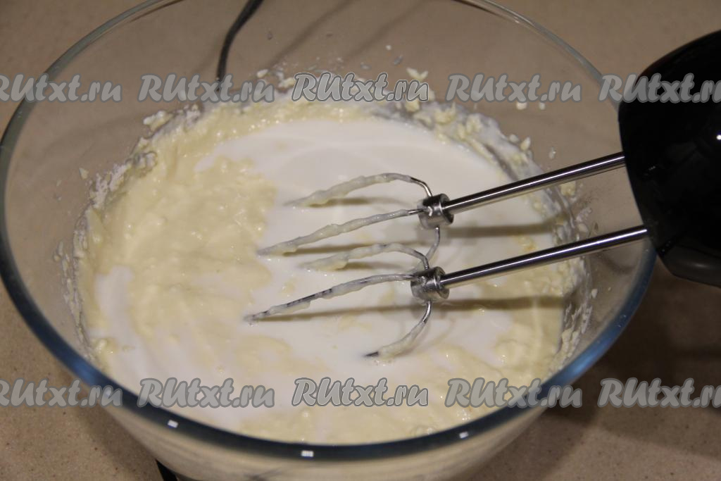 Пробить творожную массу погружным блендером до однородности. Затем всыпать муку, снова пробить блендером.