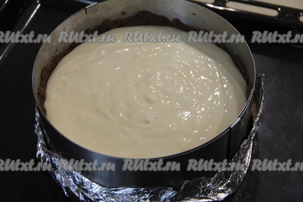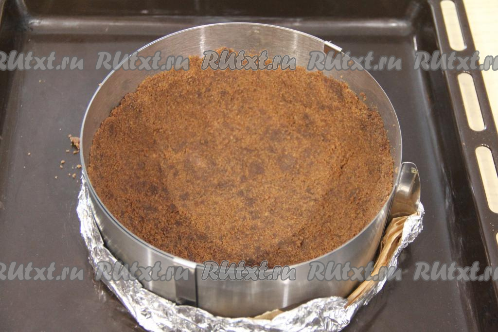 Выложить получившуюся массу в разъёмную форму диаметром 20 сантиметров и утрамбовать, сформировав высокий бортик.