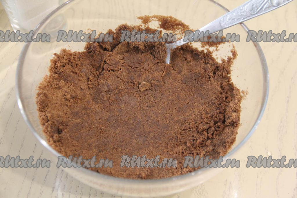 Прежде всего сделаем основу для чизкейка. Для этого нужно печенье измельчить в крошку. Удобно измельчать печенье в измельчителе. Также можно выложить печенье, поломанное на кусочки, в прочный целлофановый пакет (можно вложить пакет в пакет) и размять скалкой, катая её поверх пакета. Крошку из печенья переложить в глубокую миску, добавить растопленное (не горячее) сливочное масло и имбирь.