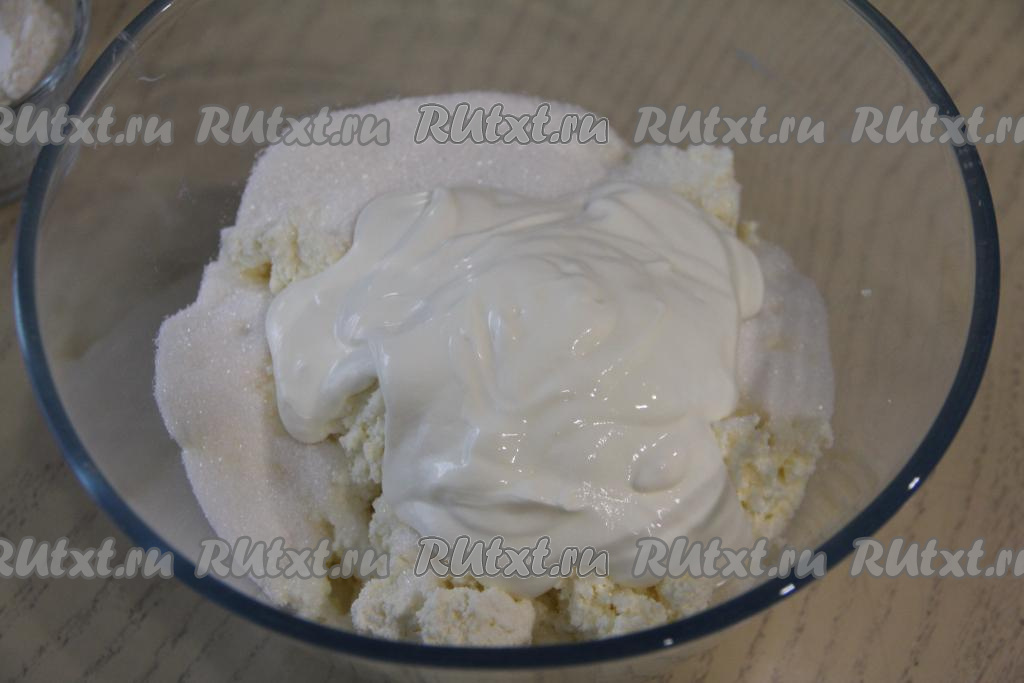 Подготовить продукты. Творог можно использовать любой жирности и консистенции. Сметану лучше брать жирностью не менее 15%.