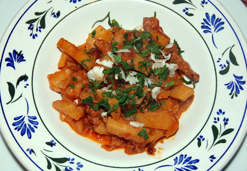 Вкуснейшее азу по-татарски готово. При подаче добавить зелень и мелко нарезанный свежий чеснок.
