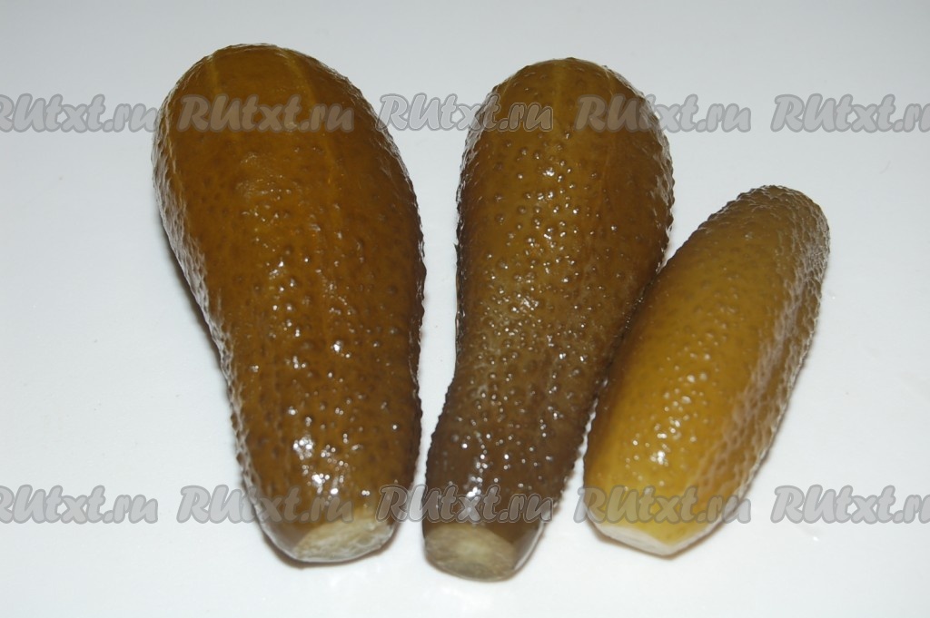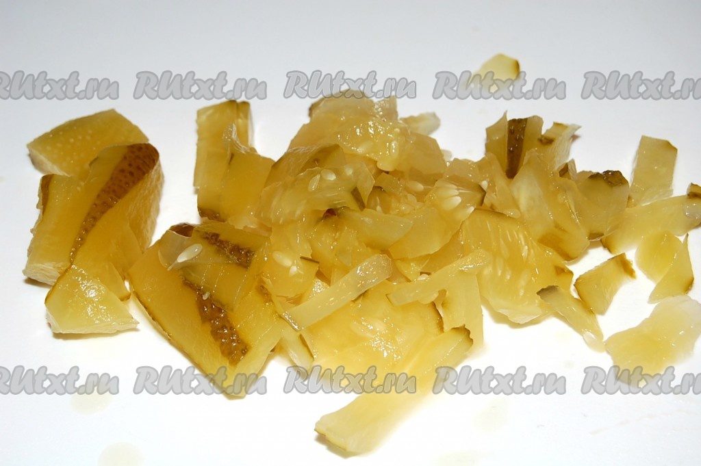 Соленый огурец очистить от кожицы, тонко нарезать.