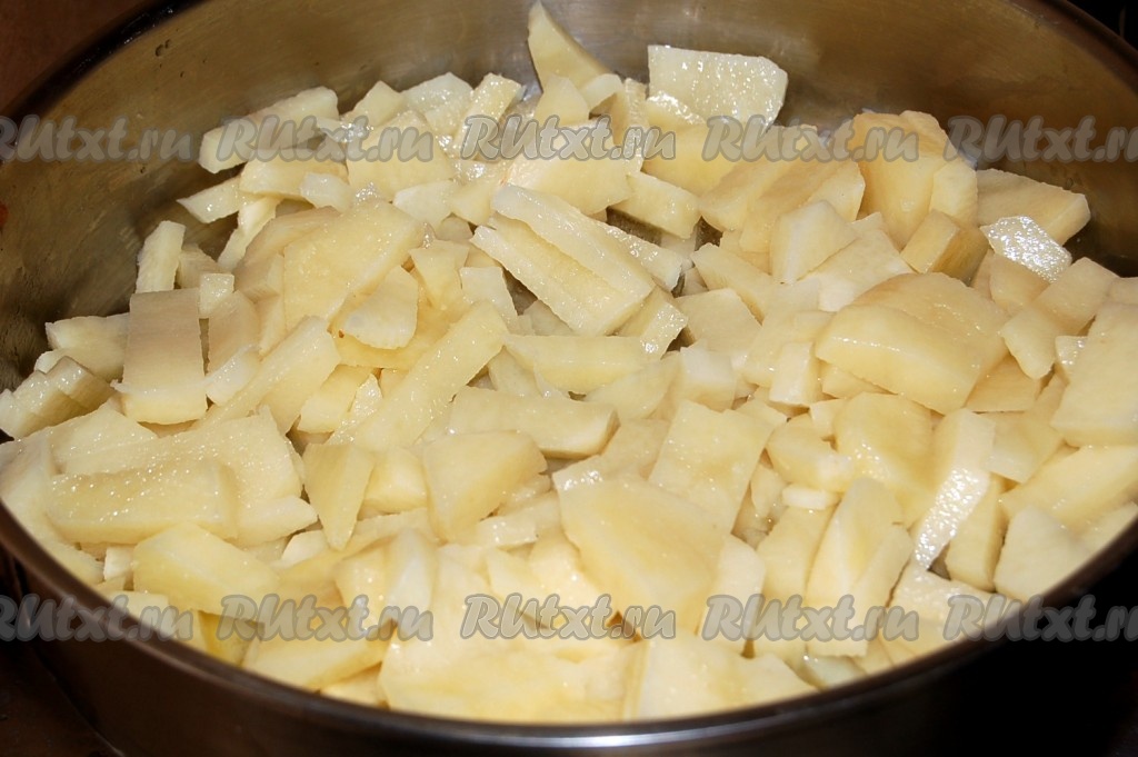 Нарезать картофель тонкими брусочками и обжарить в топленом масле 20 минут.