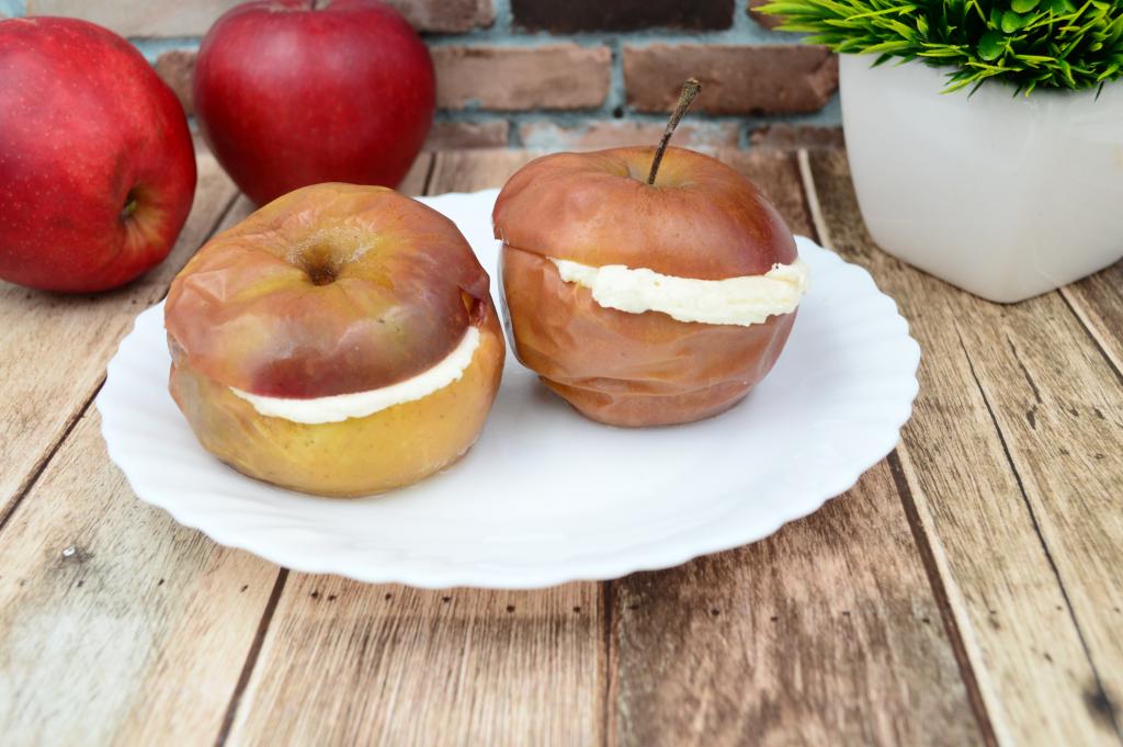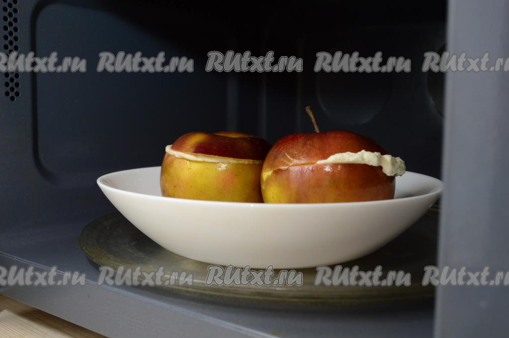 Поместить яблоки с творогом в глубокую тарелку, пригодную для СВЧ-печей. Напомню, что в микроволновку нельзя ставить металлическую посуду и посуду с блестящими элементами декора.