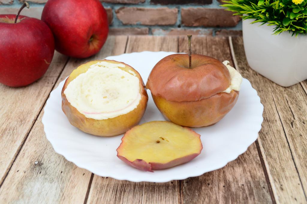 У моей микроволновки мощность - 800 Ватт. Время запекания будет зависеть от мощности вашей СВЧ-печки, от сорта, плотности яблок и от их количества. Поэтому я советую всегда запекать яблоки с небольшими интервалами. Сначала включить микроволновку на 2 минуты. Затем запекать по 1 минуте, каждый раз проверяя готовность яблок (для проверки готовности можно прокалывать яблоки зубочисткой, если зубочистка входит в мякоть легко, значит яблоки готовы). Вот такими были яблоки после 3 минут приготовления (то есть в течение 2, а затем 1 минуты запекания), творог начал немного подниматься, но яблоки ещё не готовы.