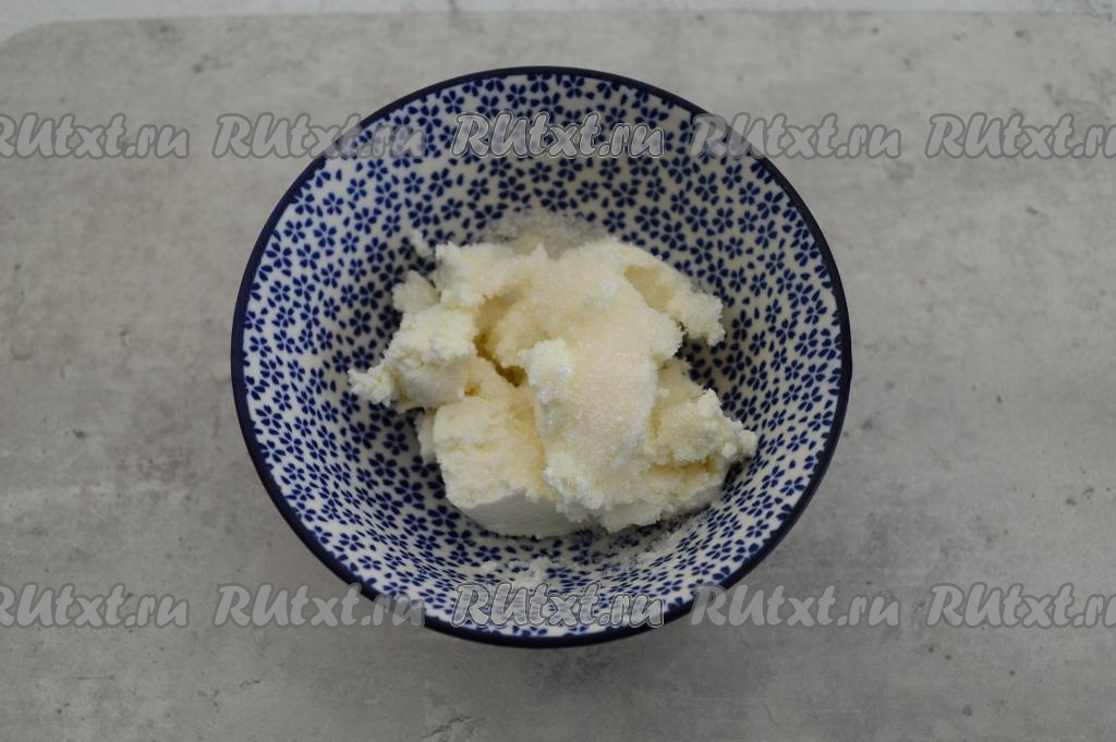 Творог смешать с сахаром. Творог бывает более или менее кислым, поэтому количество сахара регулируйте по своему вкусу.