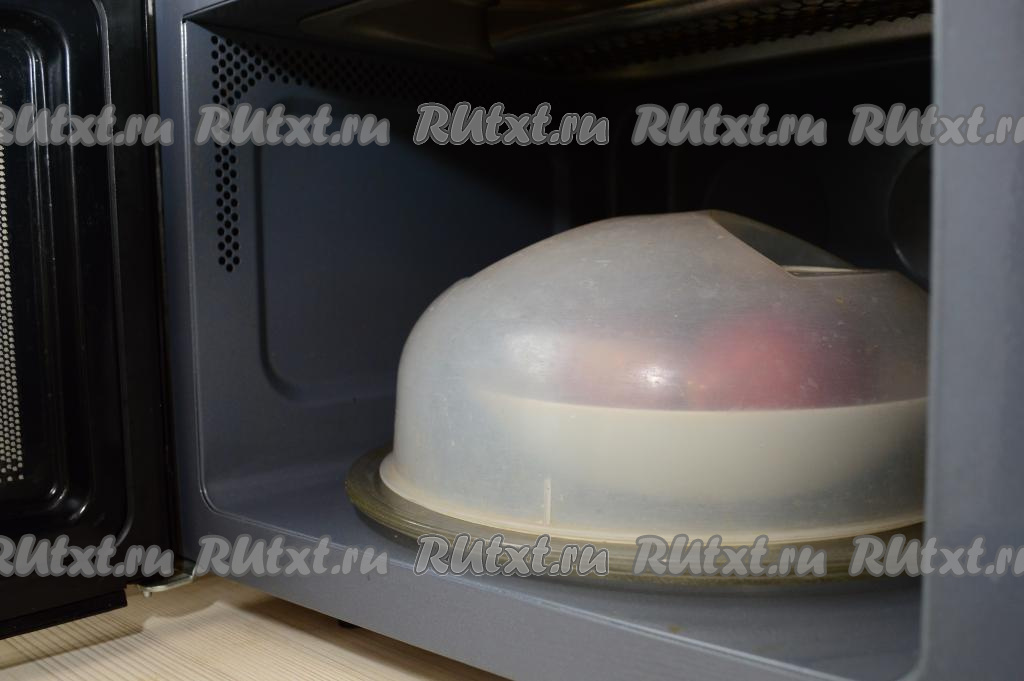 Желательно накрыть яблоки специальной крышкой для СВЧ-печей с отверстием для выхода пара (отверстие должно быть открыто).