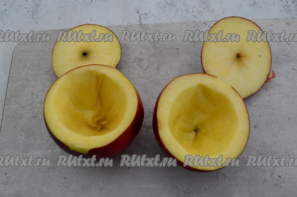 Из яблок удалить чайной ложкой сердцевину вместе с косточками. Старайтесь делать это аккуратно, чтобы у вас получилось что-то наподобие чашечки.