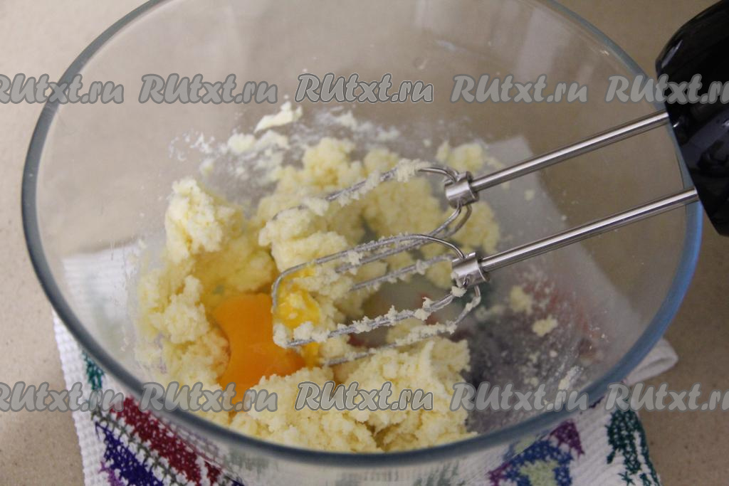 Взбить масло с сахаром с помощью миксера до однородного состояния (взбивать минуты 3). Затем добавить яйцо и взбить до однородного состояния.