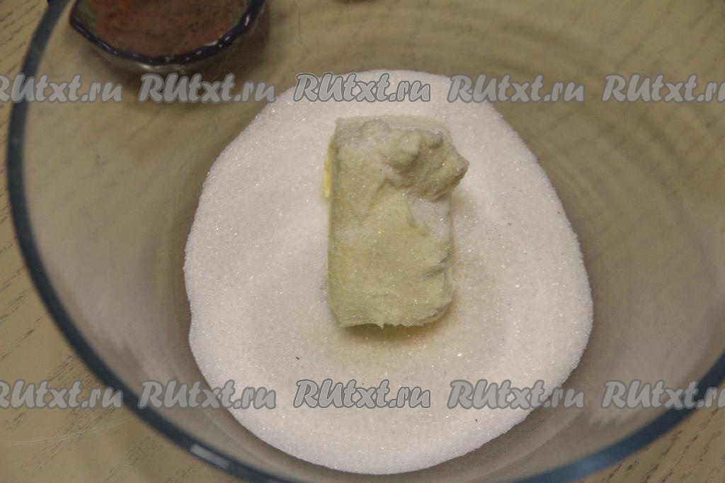 В объёмной миске соединить мягкое сливочное масло, ванильный сахар и сахар.