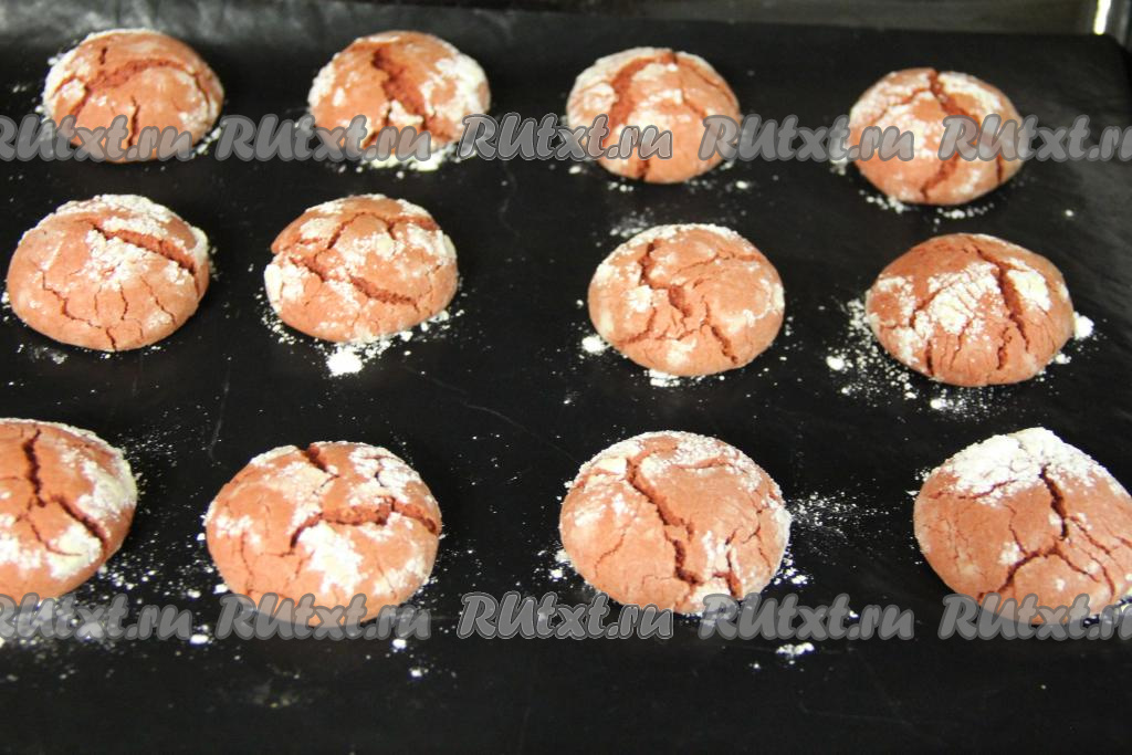Выпекать печенье "Красный бархат" в разогретой до 200 градусов духовке минут 10. В процессе выпечки печенье покроется трещинками - так и должно быть.