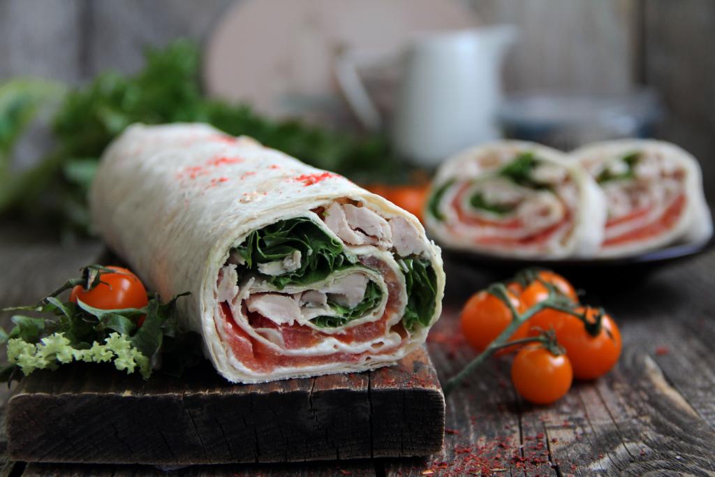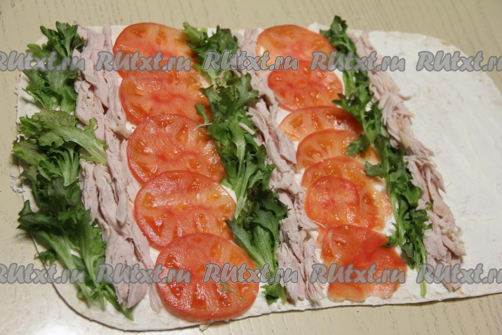 Помидор нарезать на тонкие кружочки. Мясо копчёной курочки нарезать на тонкие пластинки. Выложить начинку, чередуя полоски: зелёный салат, курица, помидор. Край лаваша оставить чистым, как на фото.