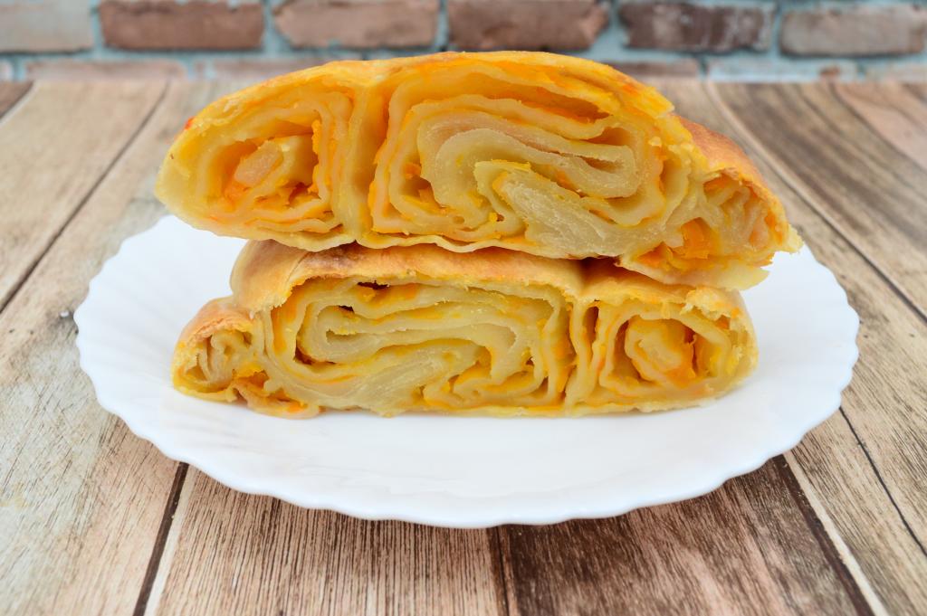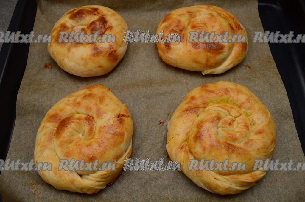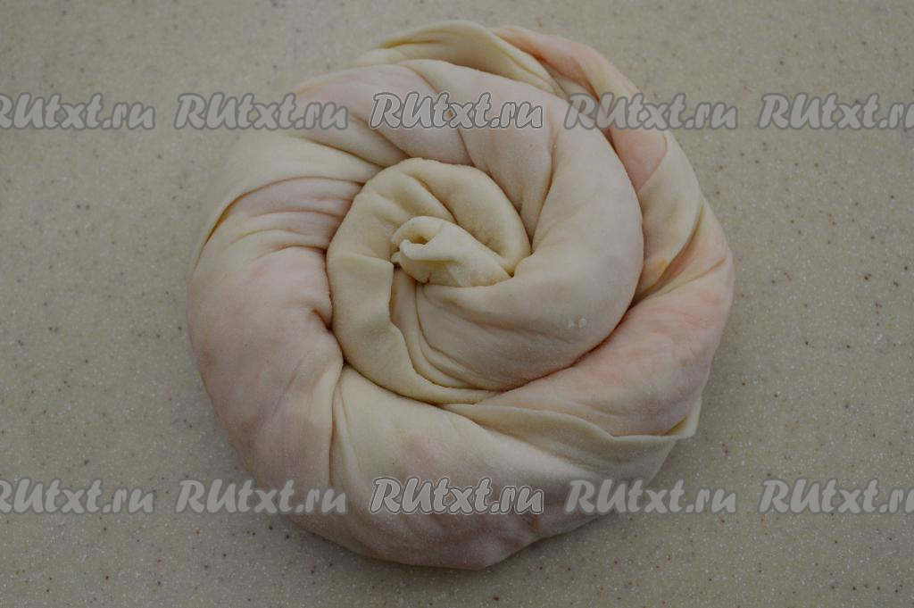 Заворачиваем рулет, начиная с одного края, в "улитку" и сразу перекладываем на противень, застеленный пергаментной бумагой. Аналогично формируем ещё 3 вертуты. Если тыквенная начинка будет выделять сок, тогда его следует отжимать, чтобы лишняя жидкость не попала в выпечку. Формировать вертуты нужно достаточно быстро, чтобы они не успели начать размокать (но и в спешке работать не нужно, важно, чтобы тесто было раскатано очень тонко).