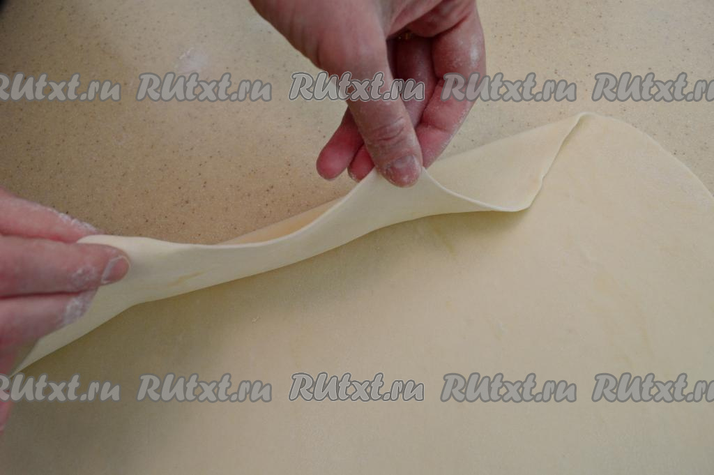 Раскатываем тесто в круг максимально тонко на хорошо припылённой мукой поверхности. Тесто нужно раскатывать практически до прозрачности, но и рваться оно не должно. Тесто приятное в работе, поэтому раскатывается легко и достаточно быстро (я в процессе раскатывания переворачивала тесто со стороны на сторону, слегка припыляя его мукой).