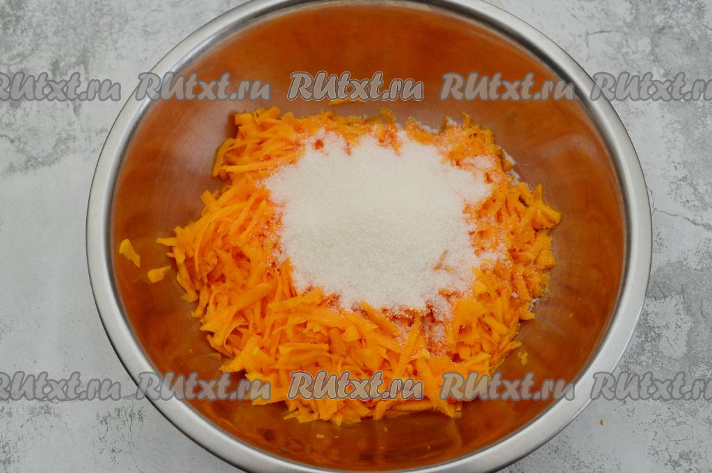 Пока тесто отдыхает, можно заняться начинкой для наших вертут. Тыкву очищаем от кожуры, убираем семечки. Нам понадобится 600 грамм очищенной тыквы. Тыкву натираем на крупной тёрке, выкладываем в миску, сразу добавляем сахар, перемешиваем. Сахар добавляйте в соответствии со сладостью тыквы. У меня была достаточно сладкая тыква, поэтому я положила 4 столовых ложки сахара. Если тыква не сладкая, тогда, возможно, понадобится чуть больше сахара (в состав теста сахар не входит, поэтому начинка должна быть достаточно сладкой).
