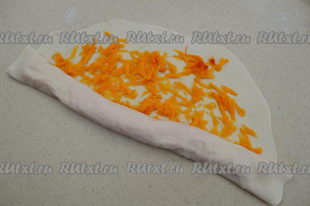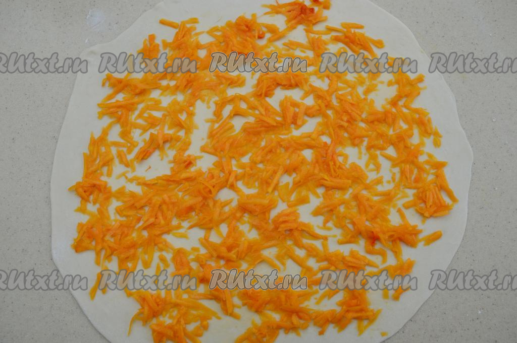Затем распределяем по тесту 1/4 части начинки, отступив пару сантиметров от края. Если натёртая тыква снова даст сок, тогда перед выкладыванием на тесто слегка отожмите тыкву рукой, чтобы лишний сок не размачивал тесто.