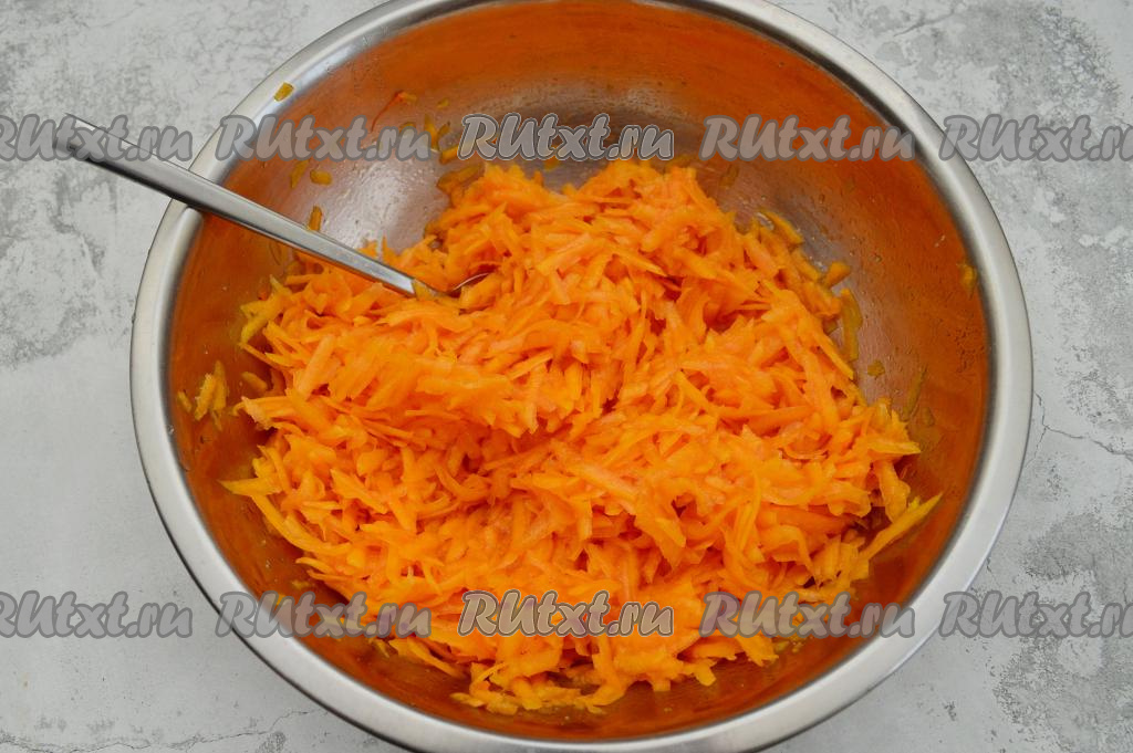Даём тыкве, смешанной с сахаром, постоять 5 минут. Если образуется сок, его необходимо слить. Затем вливаем растительное масло и перемешиваем начинку.
