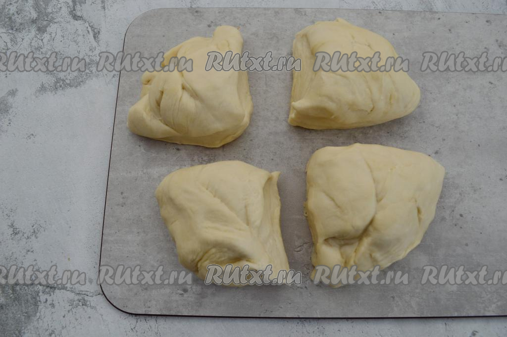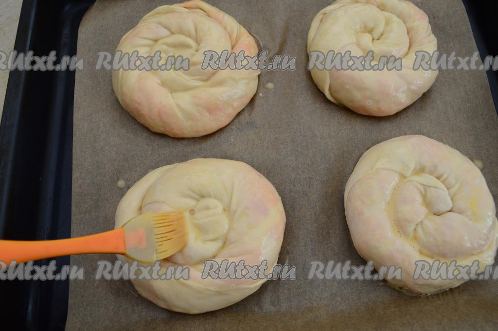 4 сформированные вертуты, выложенные на застеленный противень, смазываем сверху взбитым яйцом.