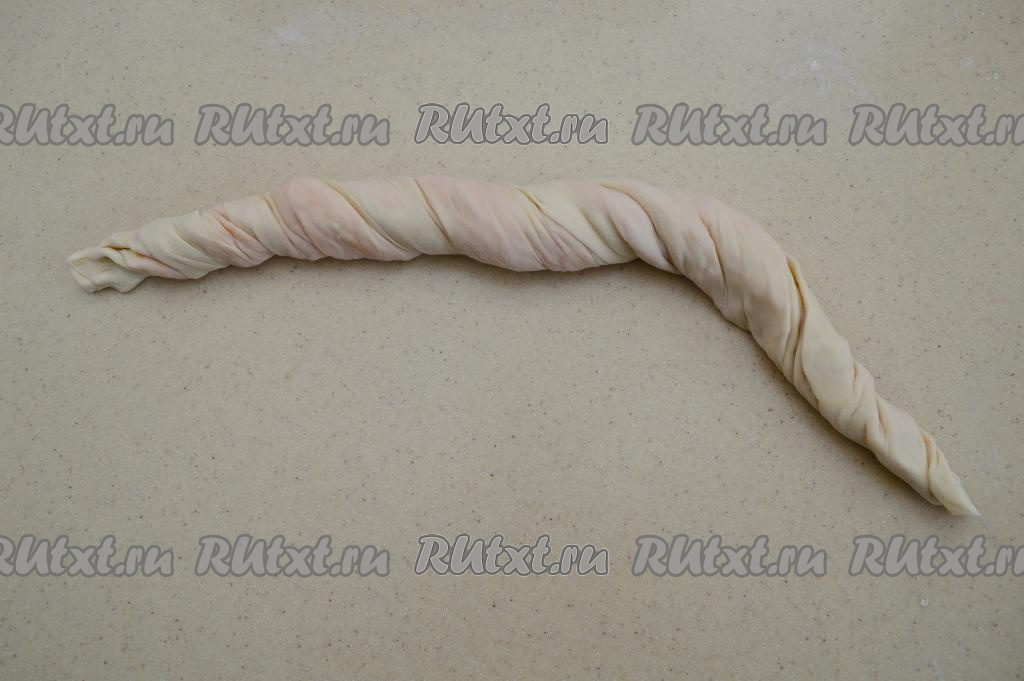 Затем плотно скрепляем концы получившегося рулета. Начинаем перекручивать рулет: перекручиваем один край рулета руками в одну сторону, а затем второй край рулета перекручиваем в другую сторону.