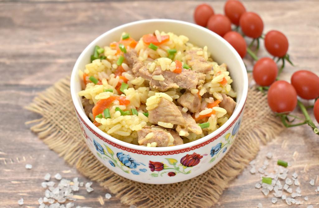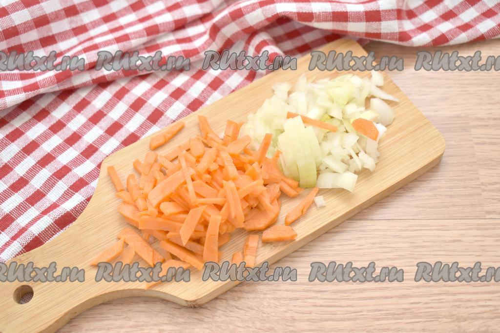 Очищаем морковь и лук, а затем нарезаем на тонкие брусочки. Рис тщательно промываем, даём стечь воде. Свинину моем и обсушиваем.