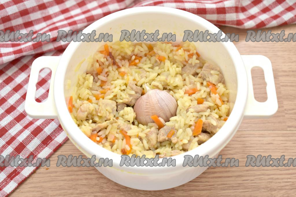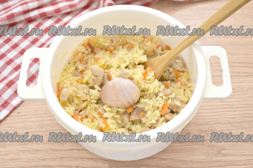 Достаём посуду из микроволновки, вода практически испарилась. Плов солим по вкусу, перемешиваем, в центр ставим целую промытую головку чеснока. Возвращаем кастрюлю в микроволновку, но уже без крышки.