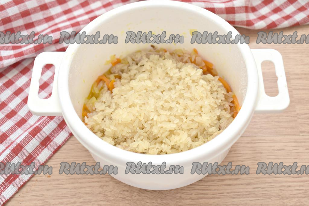 К свинине и овощам добавляем промытый рис.