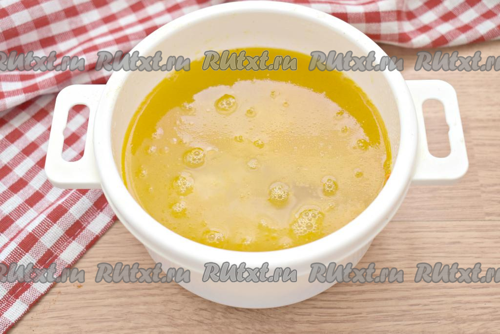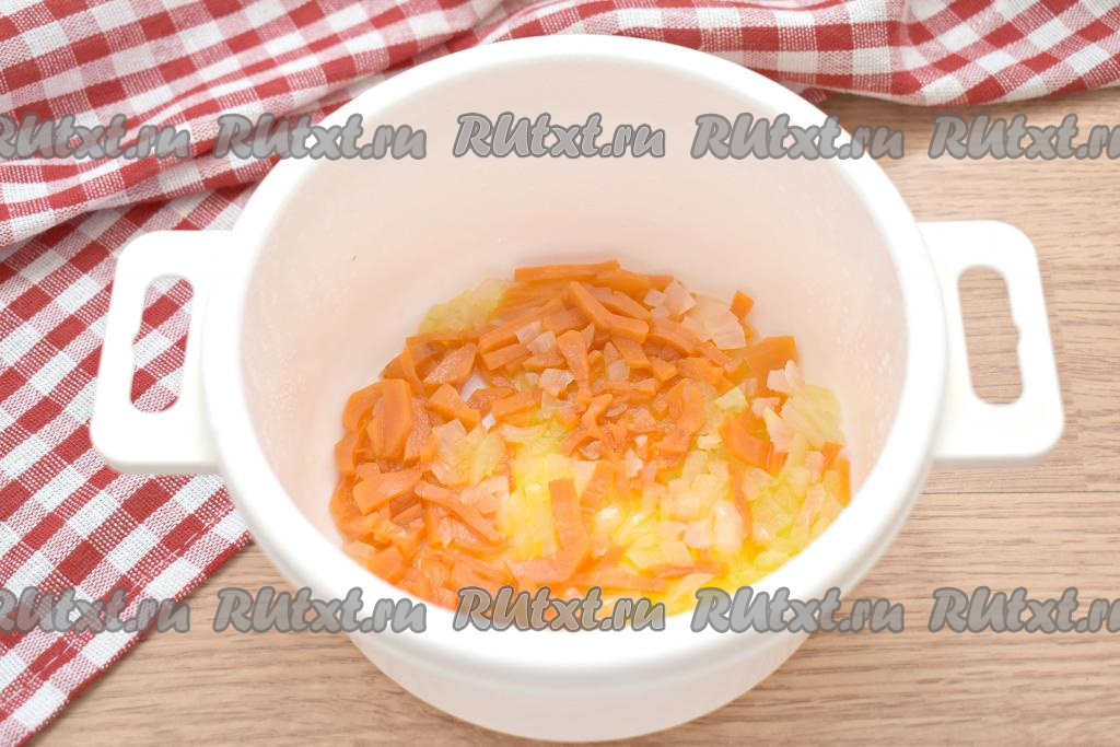 В кастрюлю, пригодную для приготовления в микроволновке, вливаем растительное масло и выкладываем морковку с луком, накрываем крышкой и ставим в микроволновку. На максимальной мощности (у моей СВЧ - 800 Ватт) готовим морковь с луком 3 минуты.