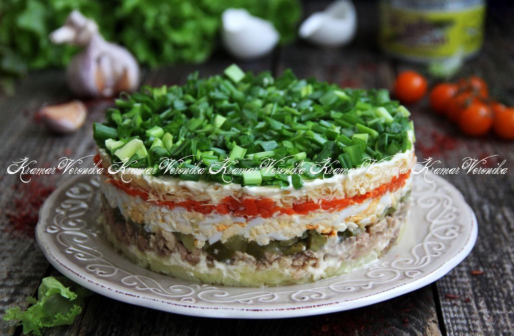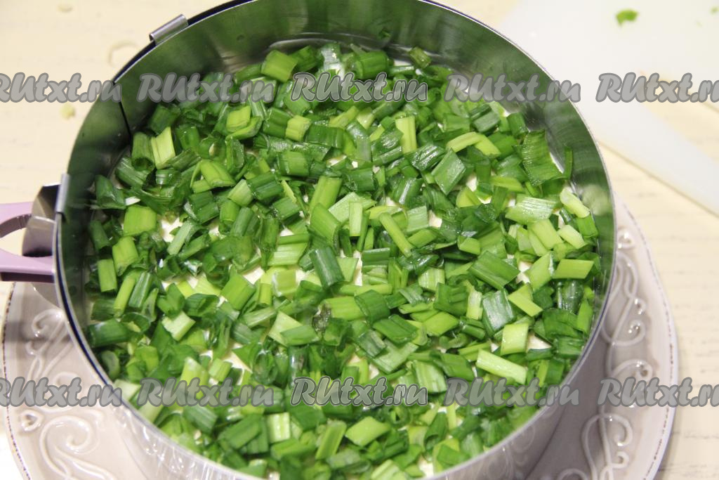 Далее равномерно распределить натёртый на крупной тёрке сыр. Нанести на сырный слой сеточку из майонеза и утрамбовать слои. Поверх сыра выложить мелко нарезанный зелёный лук. Поставить салат в холодильник на пару часов, чтобы он хорошо пропитался.