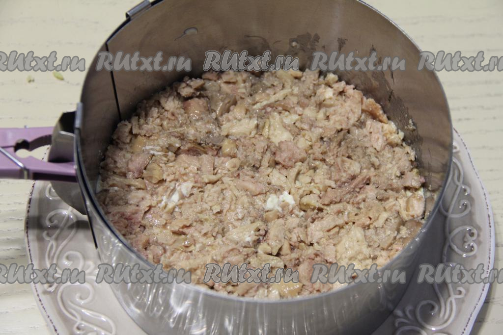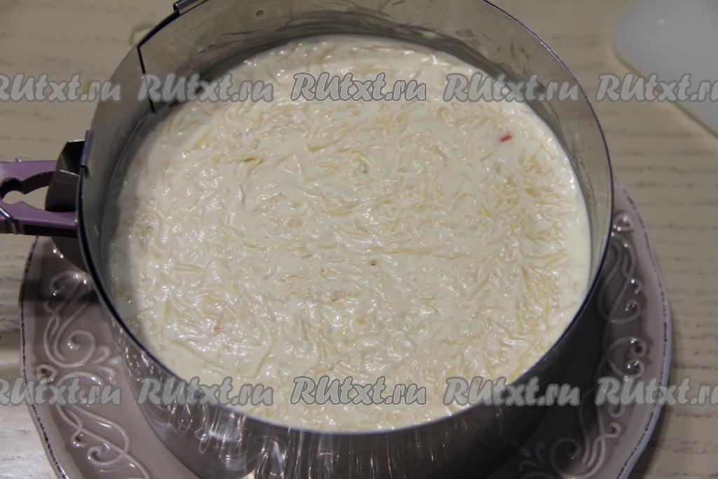 Нанести сетку из майонеза и утрамбовать слой.