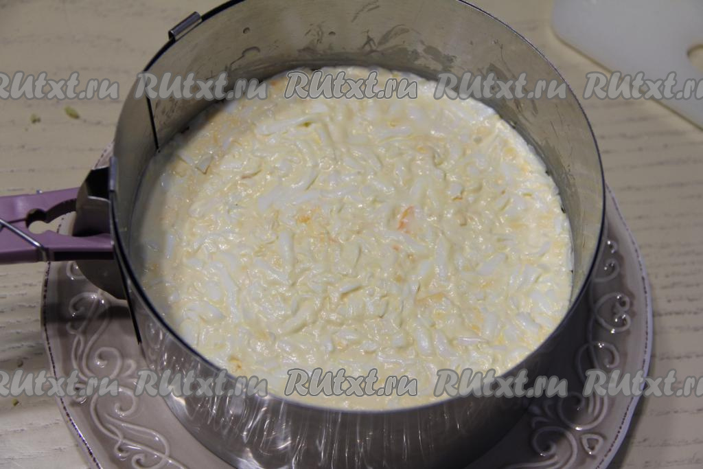 Следующим слоем выложить натёртую на крупной тёрке варёную морковь.